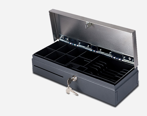 This classic cash drawer – available in wide and compact – opens under application program control and includes a media slot that can fit a document stack up to 20mm (0.75 inches) high. This cash drawer is compatible with a till-and-lock insert or plug, which may be ordered separately.